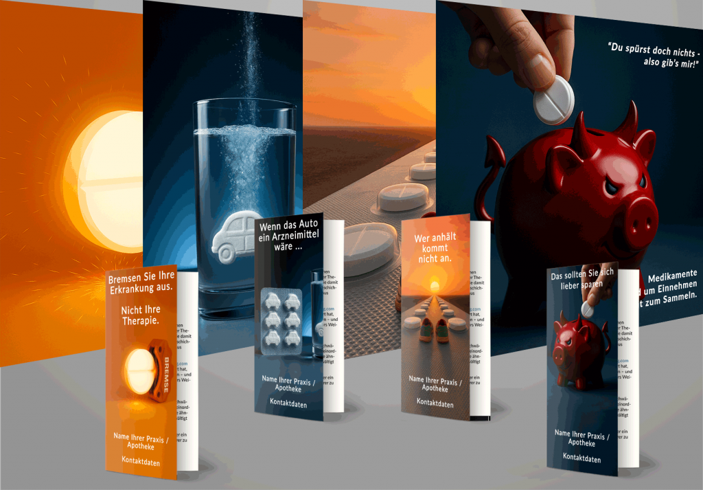 Die Flyer sind eine Werbung für nachhaltige Adhärenz – und gleichzeitig eine Werbung für Ihre Arztpraxis oder Apotheke.