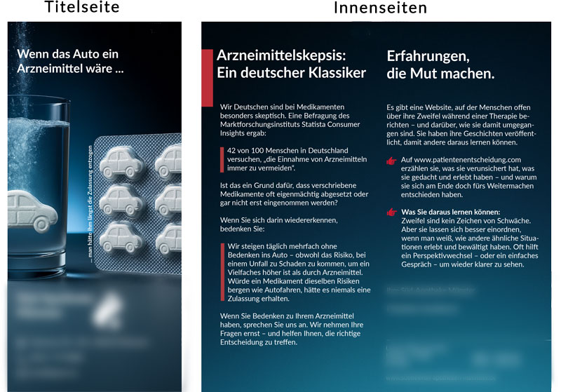 Die linke Innenseite greift dieses Denkmuster auf.  Die rechte Innenseite bietet Orientierung und stärkt das Vertrauen. Sie verweist auf die Website www.patientenentscheidung.com, auf der Betroffene offen darüber berichten, wie sie Risiken abgewogen, Fehlinformationen korrigiert und ihre Therapieentscheidung wiedergefunden haben. Ihre Erfahrungen zeigen: Wer Risiken richtig einordnet, entscheidet sicherer – und bleibt der Behandlung treu.
